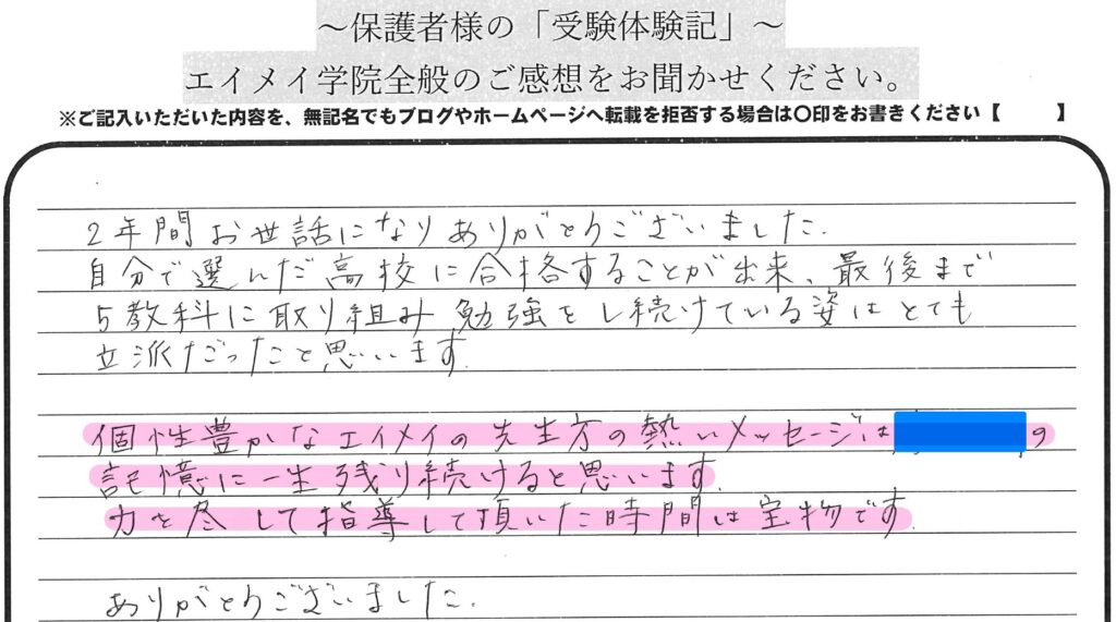 【ふじみ野】「親から見たエイメイ」 ~保護者様の受験体験記2025⑦~ 投稿日 2025年3月10日 著者 kimu カテゴリー エイメイ学院ふじみ野校舎ブログ カテゴリー キムのブログ|エイメイ学院ふじみ野塾長 2年間お世話になりありがとうございました。 自分で選んだ高校に合格することが出来、 最後まで5教科に取り組み勉強をし続けているすがたはとても立派だったと思います。 個性豊かなエイメイの先生方の熱いメッセージは 息子の記憶に一生残り続けると思います。 力を尽して指導して頂いた時間は宝物です。 ありがとうございました。 シェア ツイート LINE この記事を書いた人 kimu 記事一覧