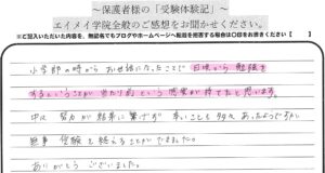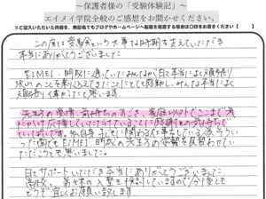 【ふじみ野】「親から見たエイメイ」 ~保護者様の受験体験記2025⑪~ 投稿日 2025年3月10日 著者 kimu カテゴリー エイメイ学院ふじみ野校舎ブログ カテゴリー キムのブログ|エイメイ学院ふじみ野塾長 本日はありがとうございました。 本当に数日前までドキドキでした。 家族で見守って行く事がとても辛かったですが、 本人は平気な顔をしておりましたが、 とても辛く淋しい気持ちだったと思いますが、 先生が最後までささえて、 見守っていただいたおかげで安心して受験出来たのだと思います。 本当にありがとうございました。 シェア ツイート LINE この記事を書いた人 kimu 記事一覧