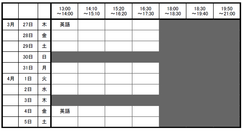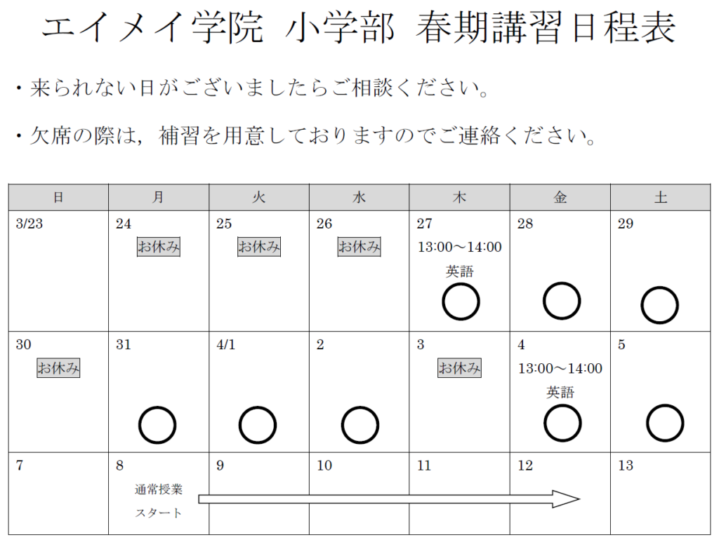 英語…集団指導 3/27.4/4(13:00~14:00)