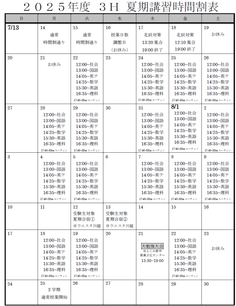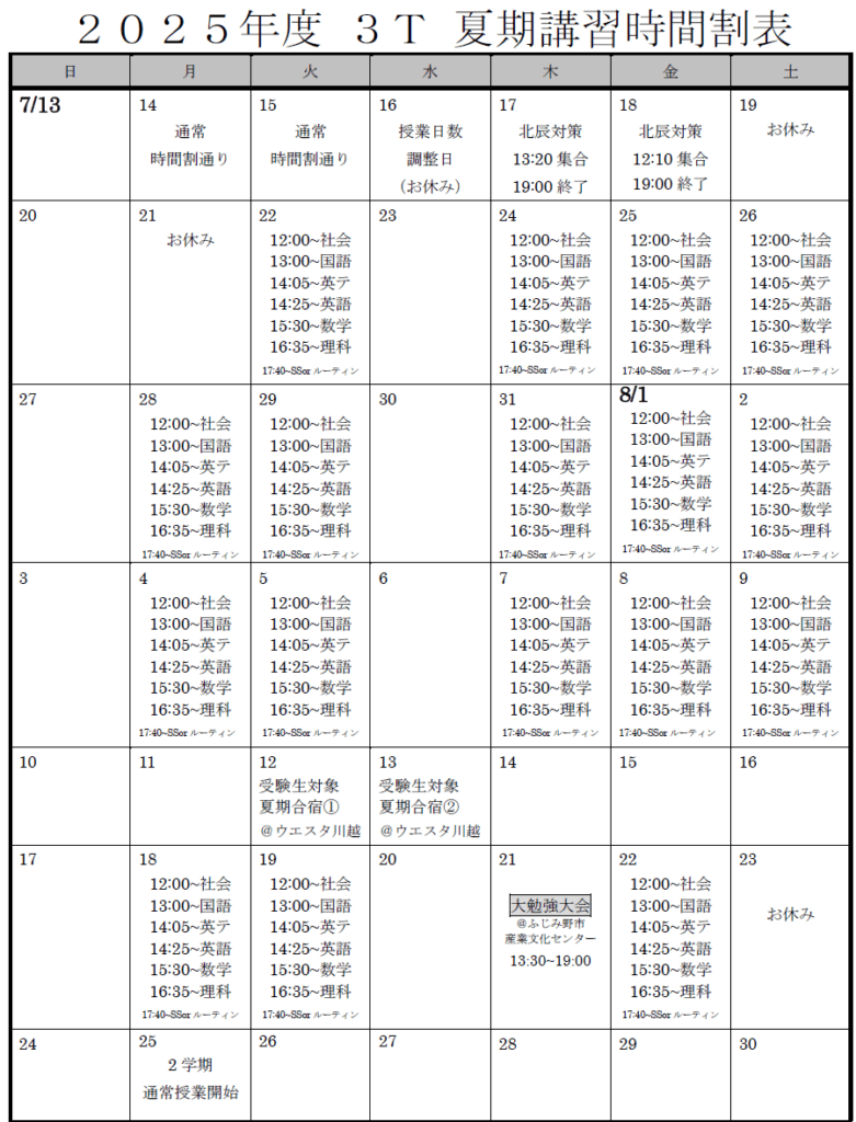 ・中学生は、夏期講習の間は通常授業はありません。