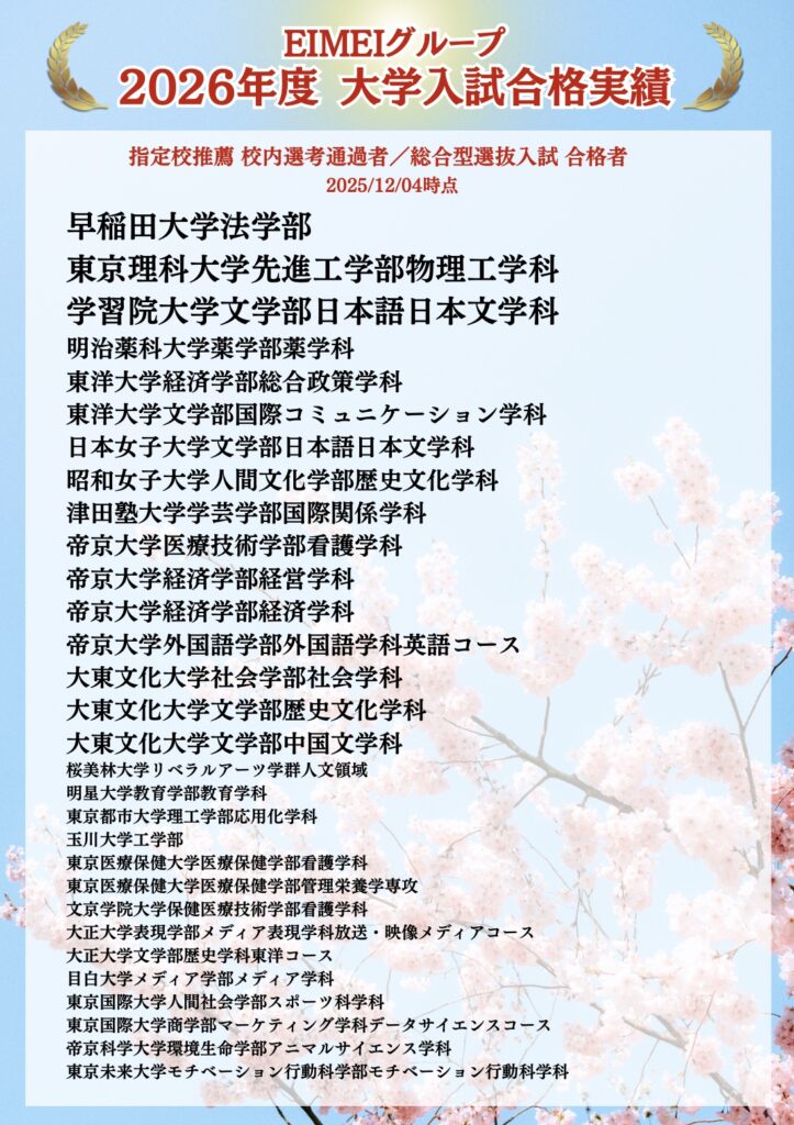 実は、EIMEIグループの2026年度の大学入試の結果も続々と出てきています。