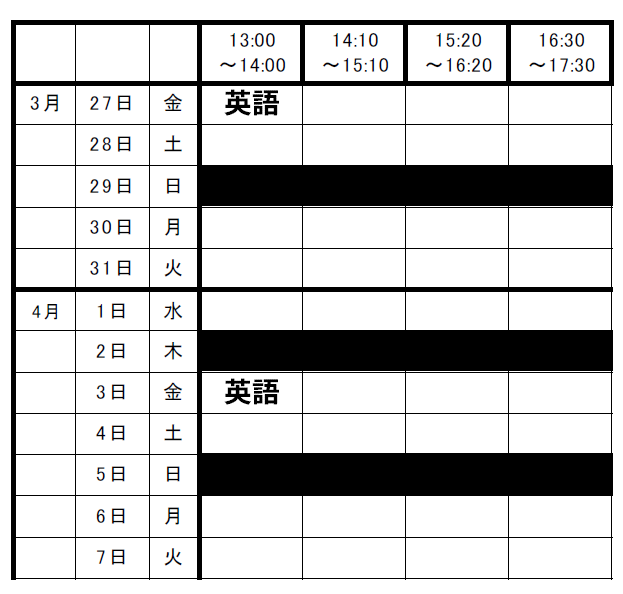英語…集団指導 3/27.4/3(13:00~14:00)