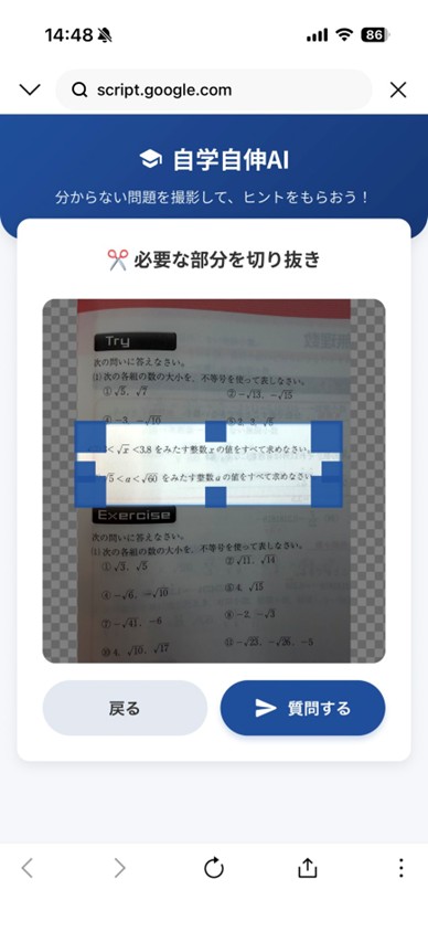 質問をしたい問題の写真を撮り、アプリ上でその問題だけをトリミングします