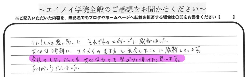 大切な時期にエイメイの先生方と出会えたことに感謝しています。