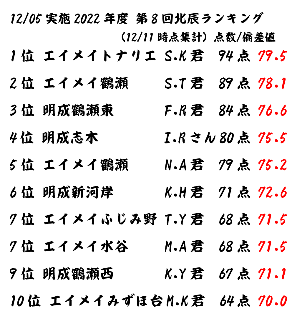 どうもこんにちは、エイメイ学院のASKです✋️ 先週に行った合格講座(選択問題)の北辰テスト2022 そのランキングを載せます コチラです はい~ 偏差値70の子、安定してきましたねー だんだんと名前が固定 […] -