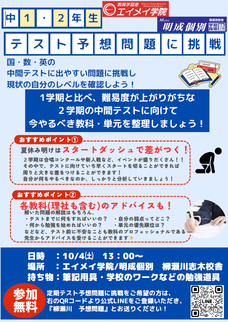 中間テスト対策講座があります!(日程等は校舎ごとにお知らせいたします!)