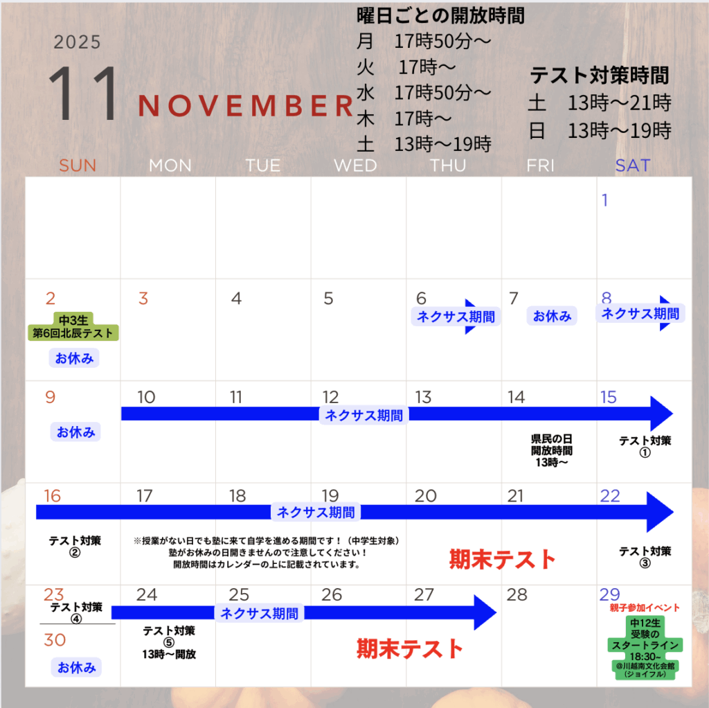 ネクサス期間は通常塾があいている日で実施をするので、金日はお休みとなっております。