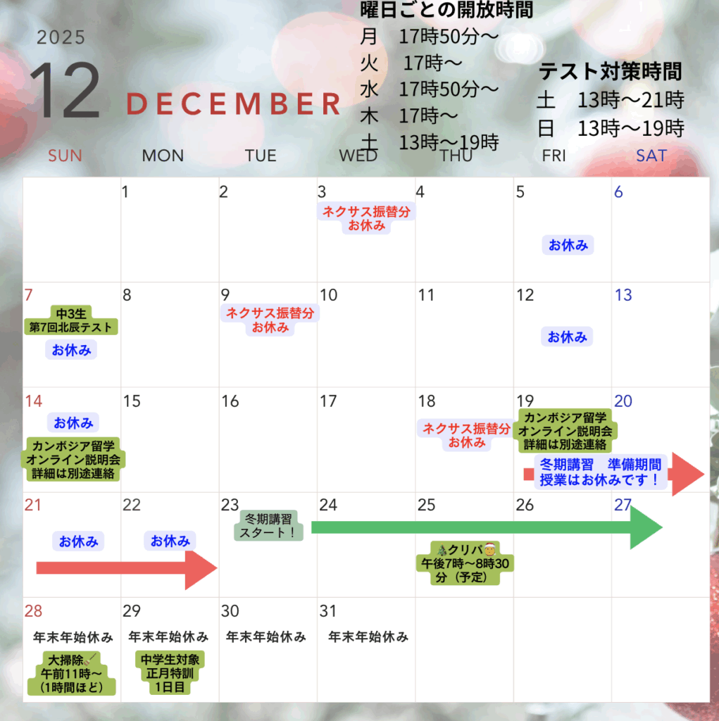 ・ネクサス振替分お休み→全学年授業はお休みです。小学生は冬期講習でコマ数の調整が入ります!