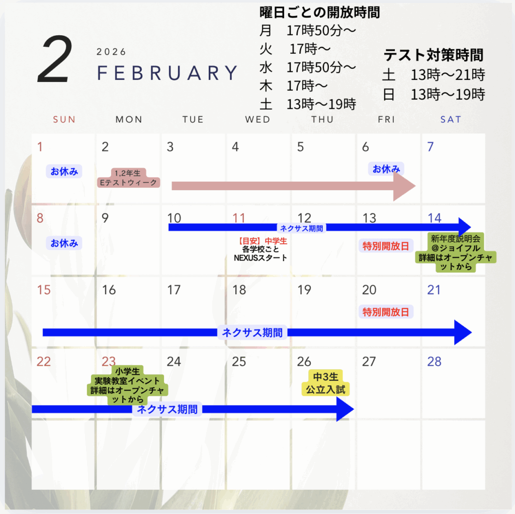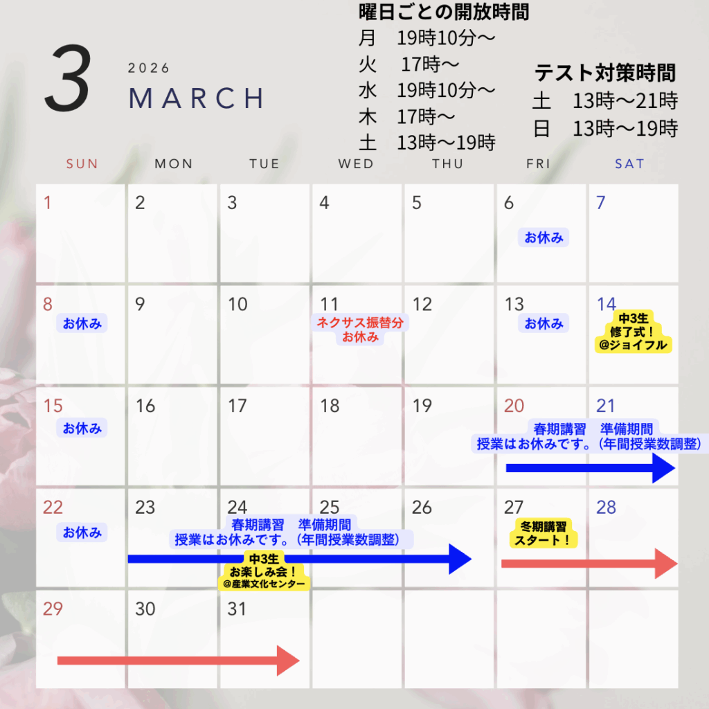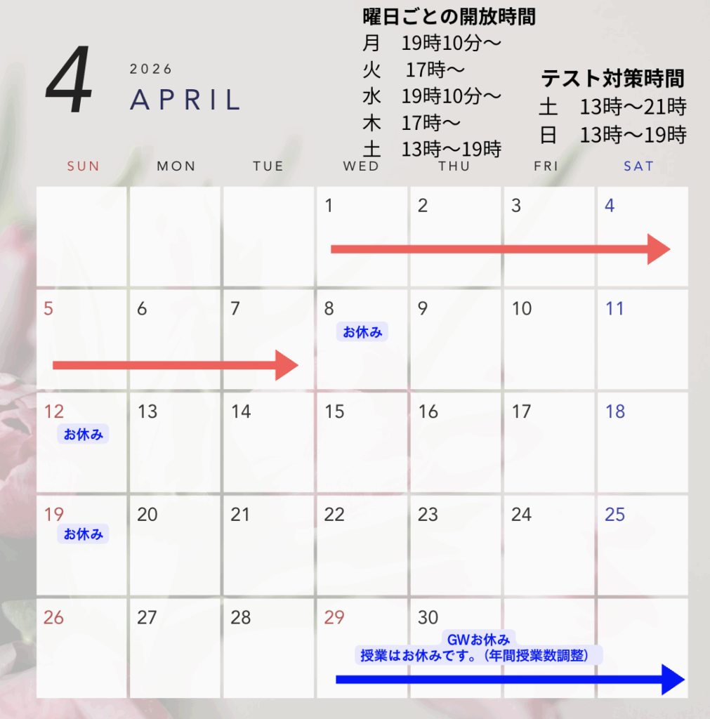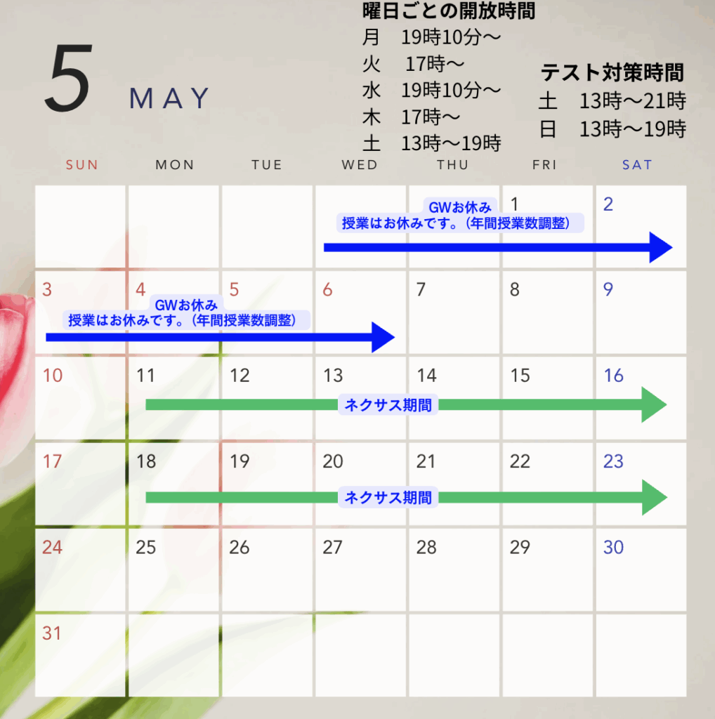 ・4月のGWのお休みは確定ですが、中学校によってはテストが近い可能性もありますので、その場合は別途対策の日程をお送りいたします。こちらは年間予定が出てからになりますので、年間予定予定表が配布されましたら、共有していただけると幸いです。。。!そのため、ネクサス期間も暫定となっております。