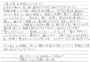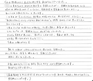 中3になる直前の春休みからエイメイに入りました。皆さんになじめるか、塾の空気に慣れるのか、続けられるか始めは不安でしたがストレスを抱えながらも 最後まで続けてこられたのは、やはり先生方の熱意と愛情のおかげだと思います。