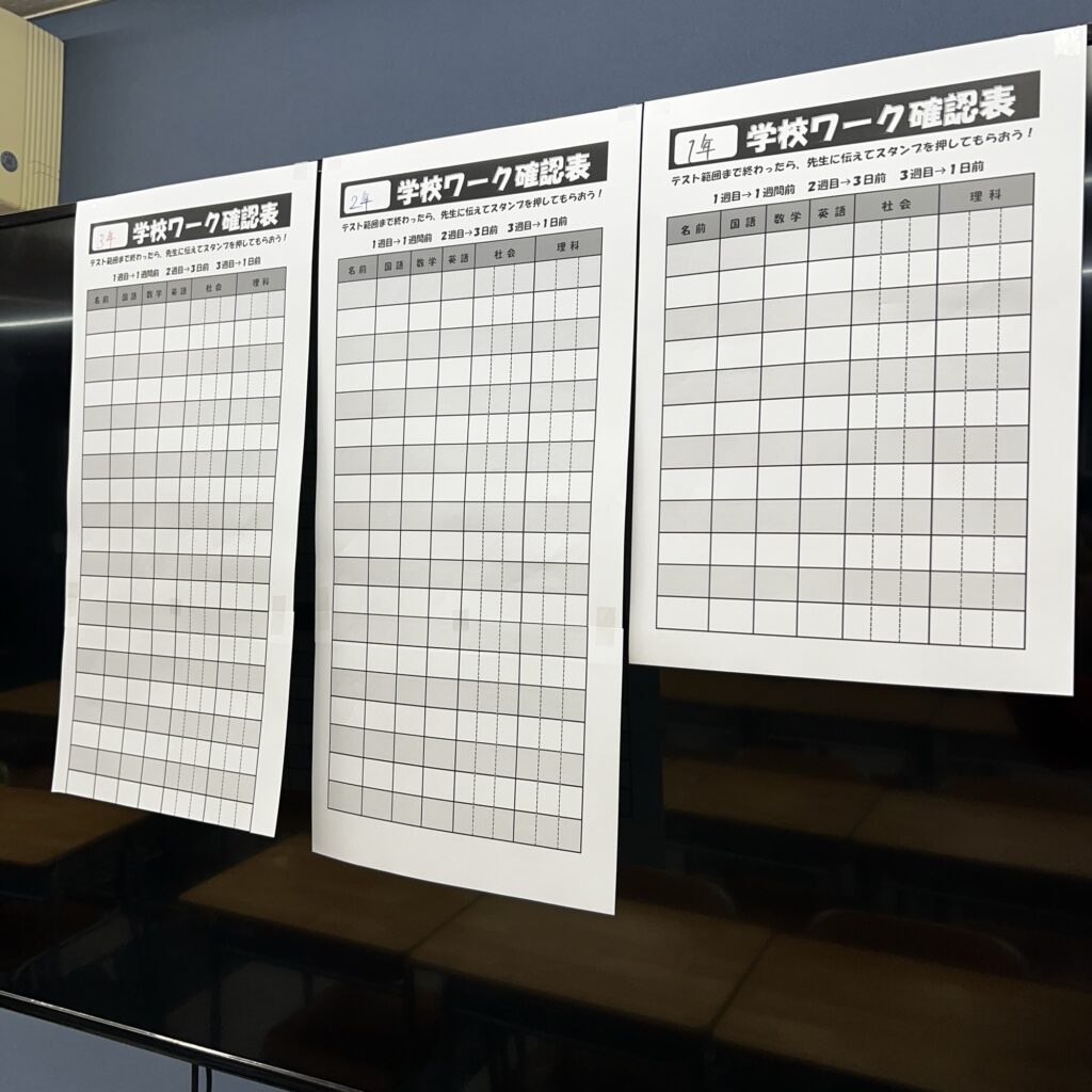 本日、3階の教室にワーク進捗管理表を貼り出ししました!