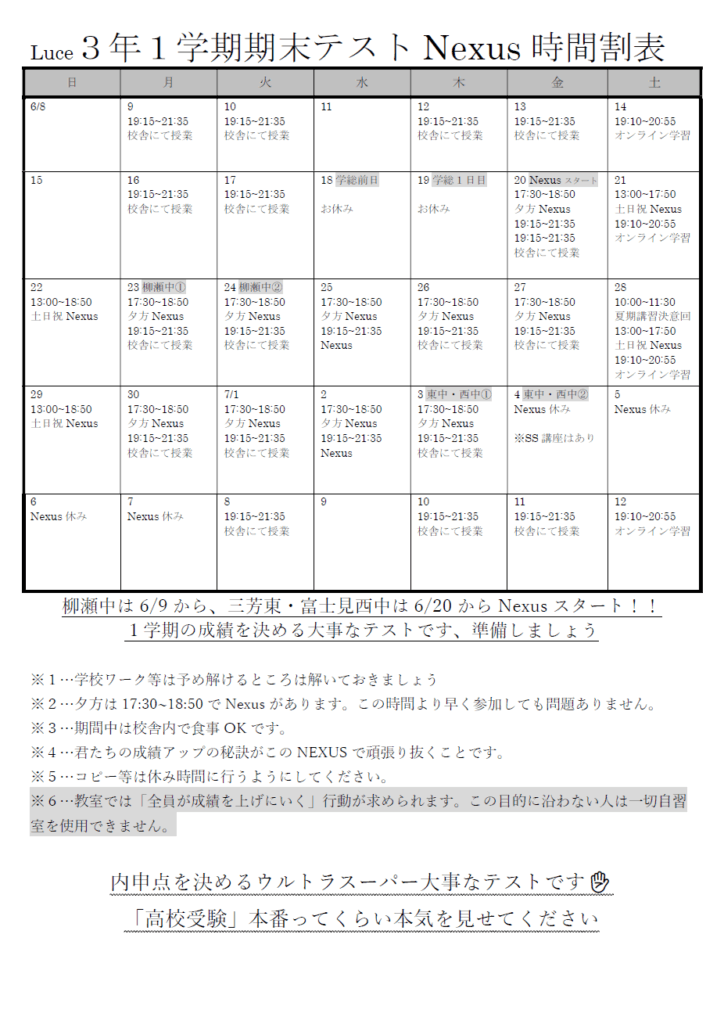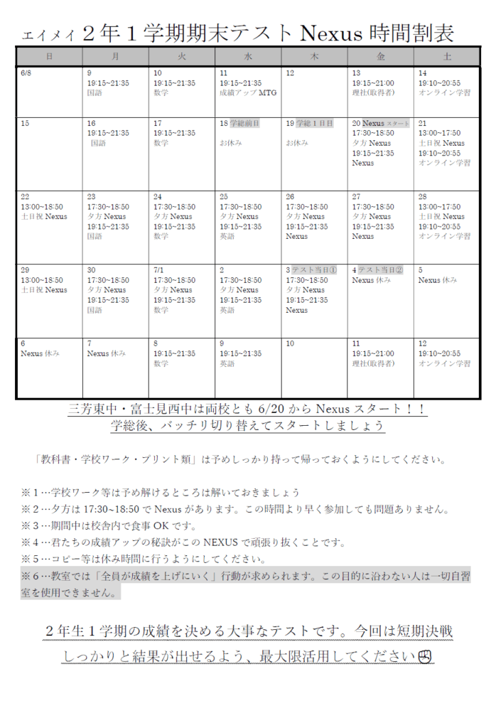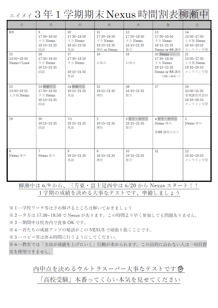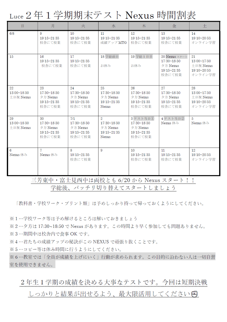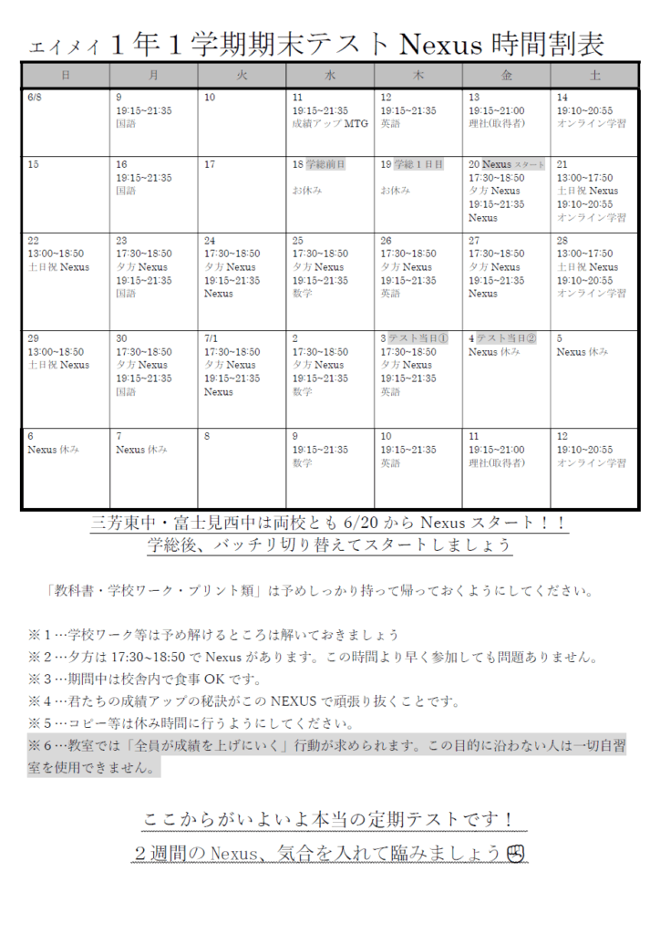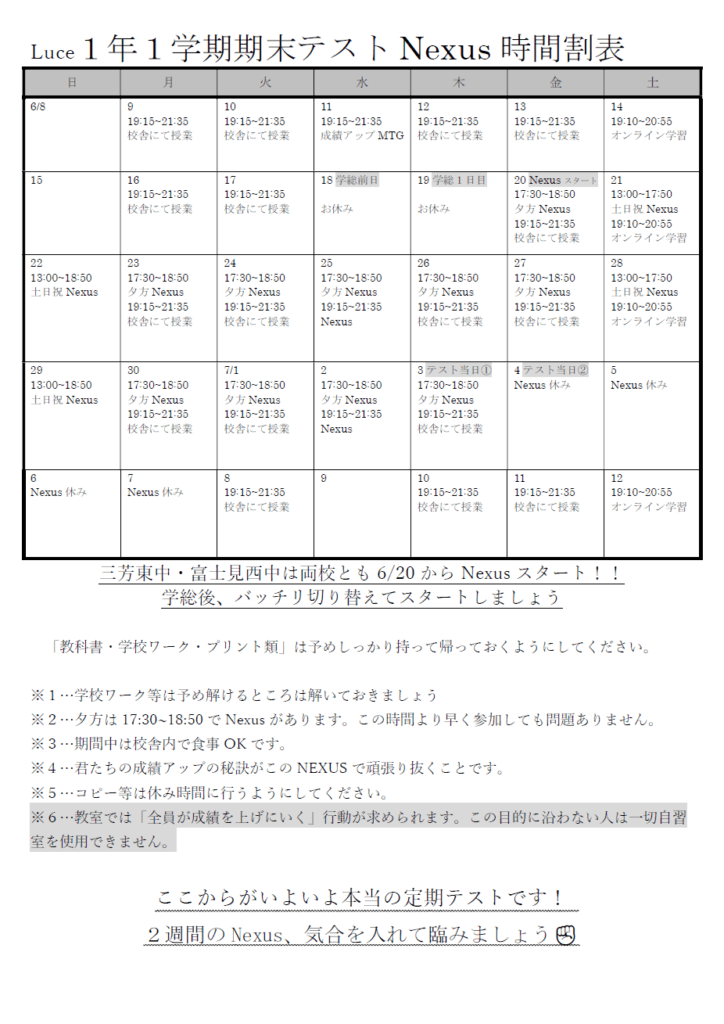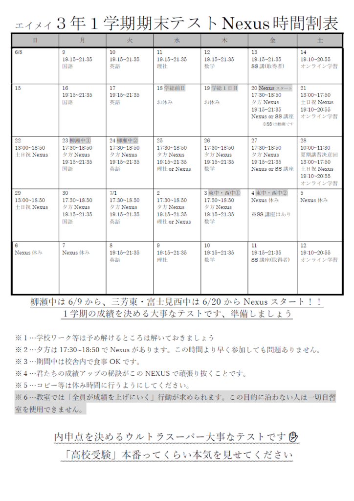 【みずほ台】1学期期末テストNexusの時間割が出来ました!