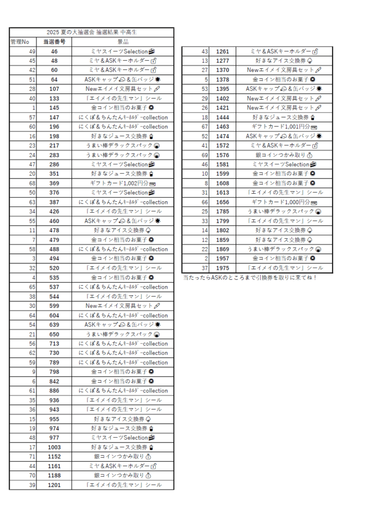 1学期期末テスト期間において配っていた大抽選会の抽選券!!