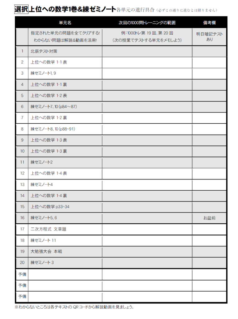 夏期講習全20日間を、しっかりと1,2年の復習ができるように組んだ