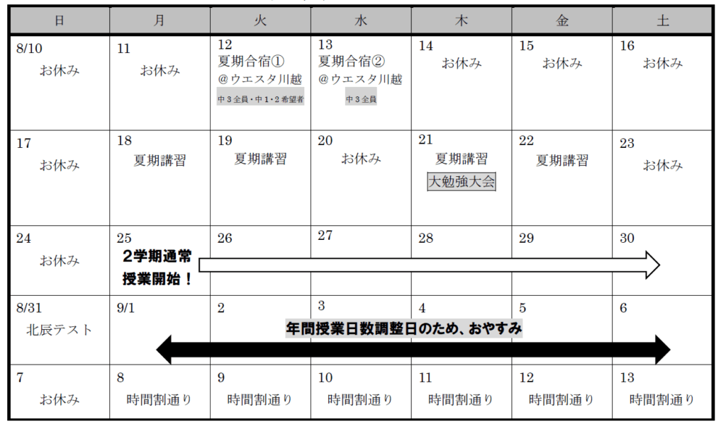 ※9/1(月)~9/6(土)は、年間の授業日数を調整するため「お休み」になります。できる限り、テストや受験などに影響の少ないところに休みを配置しています。