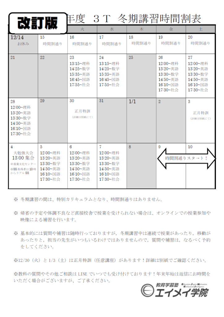 ★12月30日(火)と1月3日(土)は、EIMEIグループ全校舎合同の正月特訓があります!夏の合宿同様、差のつきやすい期間でみっちり追い込みをかけてまいりますので、3年生は強く受講をオススメします!詳細は以下のリンクよりご確認ください。