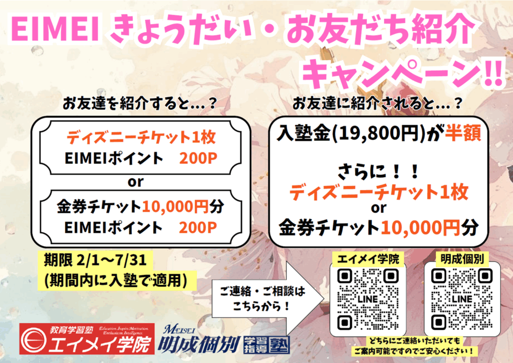 EIMEIグループでは現在、お友だち紹介、きょうだい紹介キャンペーンを実施中‼️