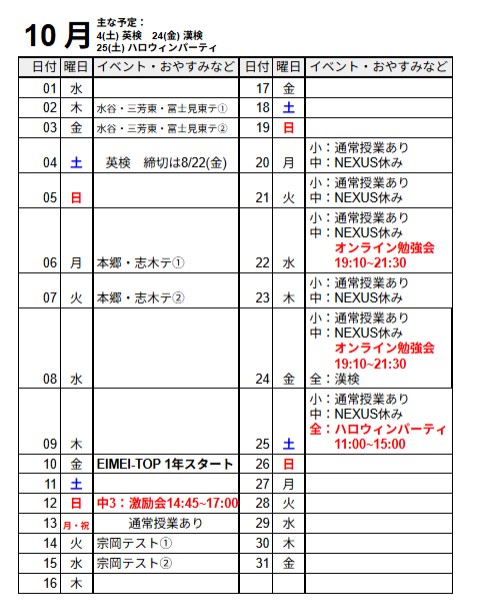 現在の掲載は10月、11月、12月の予定表となります!