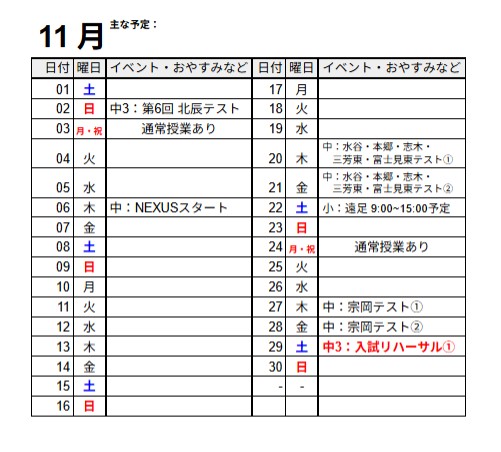 【水谷全学年】月間予定まとめ