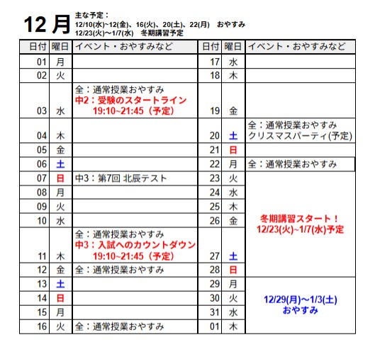 ※小学生は通常通り授業あり、中3生は合格講座のみあり
