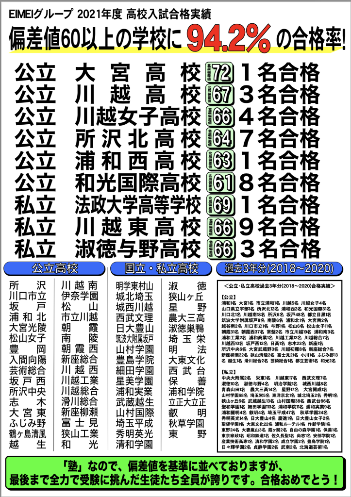 偏差値60以上の難関校に毎年多くの生徒が合格しています。