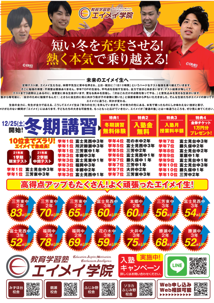 エイメイ学院には、富士見市(みずほ台 鶴瀬 )・ふじみ野市(ふじみ野 上福岡)・三芳町周辺の生徒が多く通ってきてくれています。