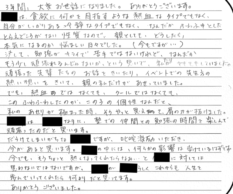 3年間お世話になりました。 同じ中学のメンバーと常に刺激し合いながら学力を上げていく息子を見て、 […] -