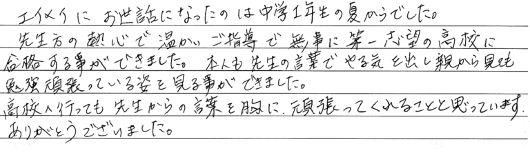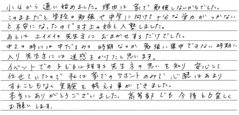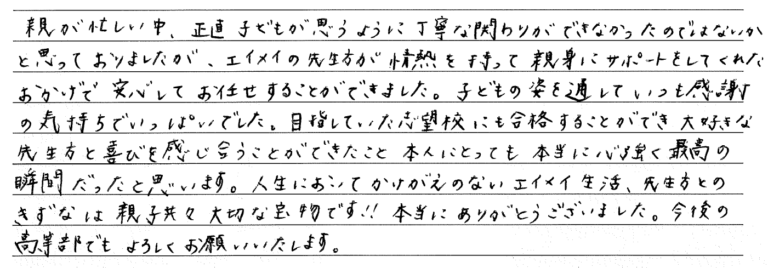 エイメイにお世話になったのは中学1年生の夏からでした。 先生方の熱心で温かいご指導で無事に第一志 […] -