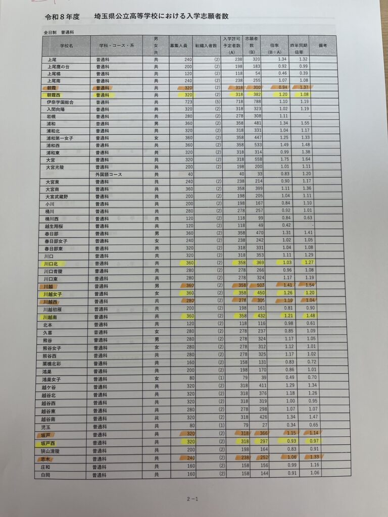 最新の倍率発表!2/10(火) 埼玉県公立高等学校について