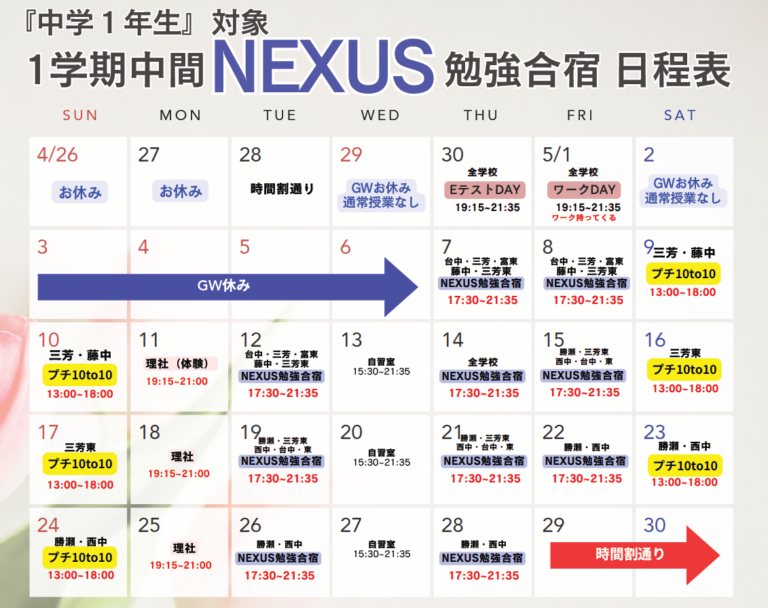 テストが早い学校は、 4/23(木)からNexus勉強合宿が始まりました! ※GW期間4/29・ […] -