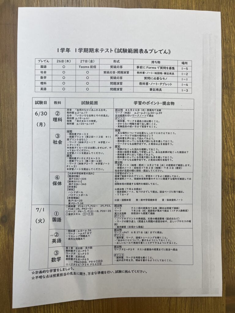 配られた期末テスト範囲表をよく読み、今やるべきことを1つずつ着実にこなしていきましょう💪