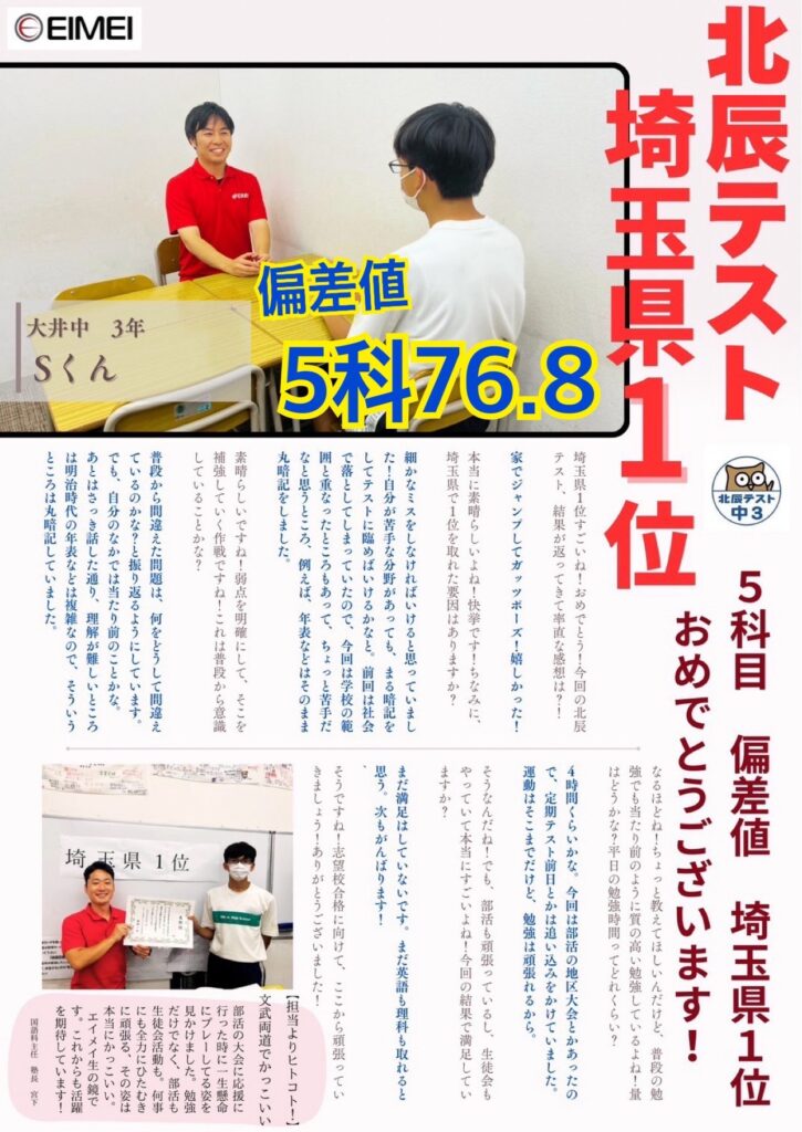 北辰テストにて、埼玉県で堂々の「第1位」を獲得した生徒が出ました!