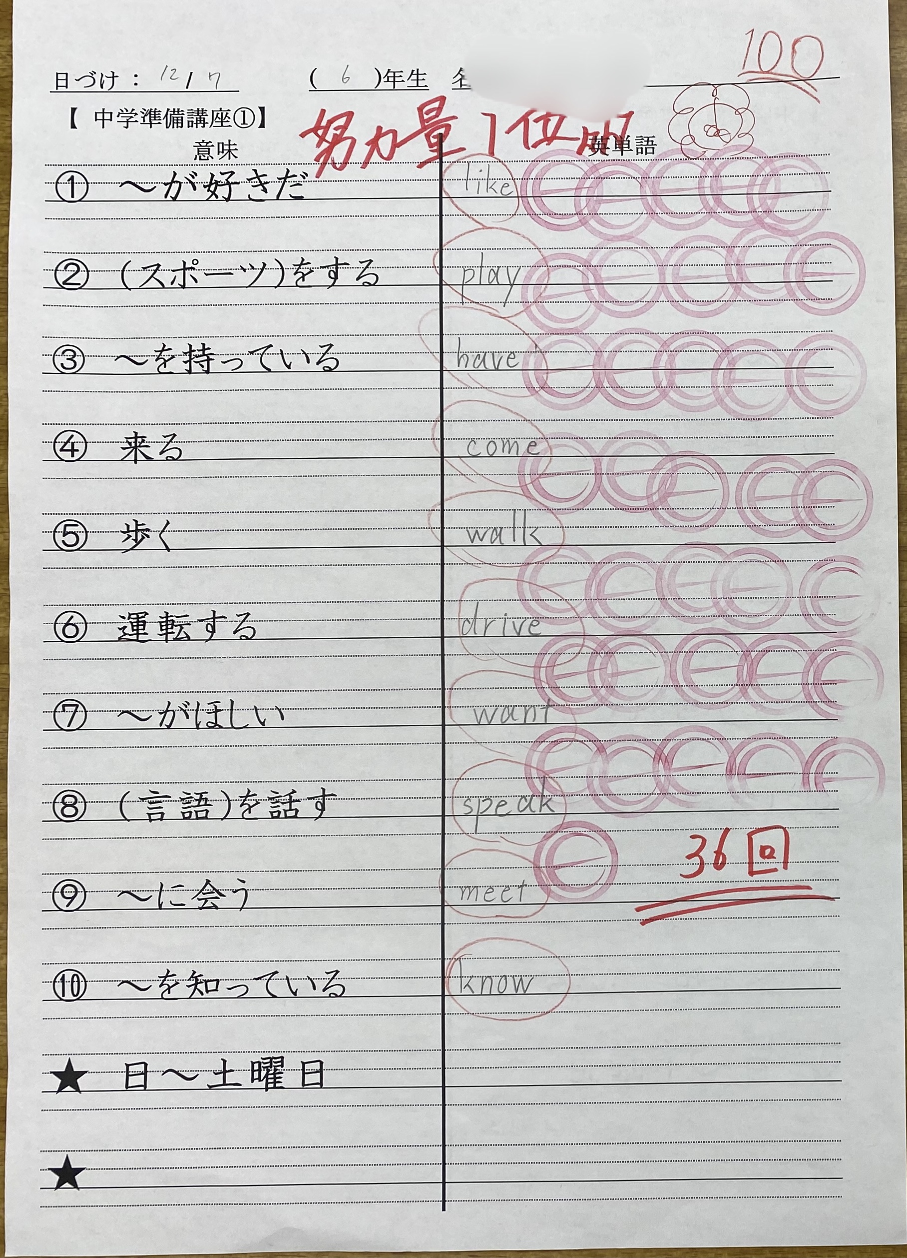 冬恒例の「英単語 不規則変化テスト」。満点が取れるまで、頑張っています!!