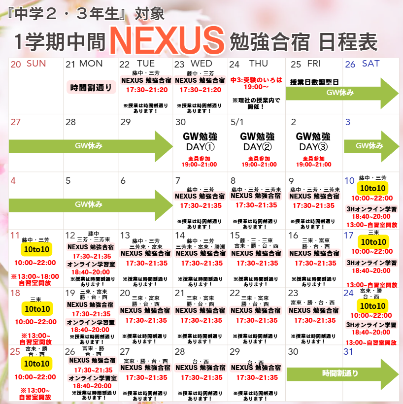 “NEXUS”勉強合宿…通常授業の時間割をぶっ壊し、テスト対策に特化した時間割で授業を行います。その中で、演習時間の確保・各教科の先生による対策授業を両立して行うことで、点数UPを目指します。