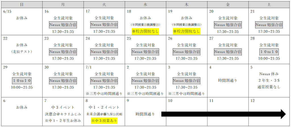 “NEXUS”勉強合宿…通常授業の時間割をぶっ壊し、テスト対策に特化した時間割で授業を行います。その中で、演習時間の確保・各教科の先生による対策授業を両立して行うことで、点数UPを目指します。