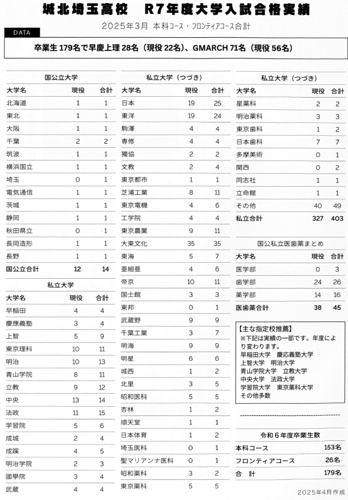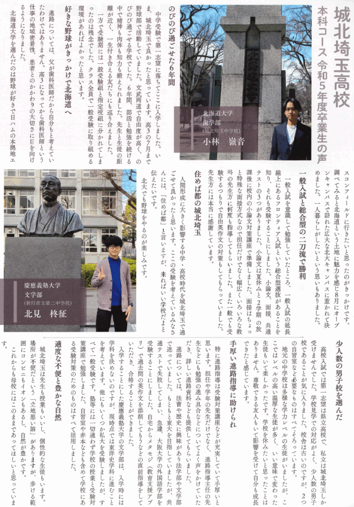 城北埼玉高校・簡単紹介! 投稿日 2025年6月22日 更新日 2025年8月6日 著者 yone カテゴリー エイメイ学院鶴瀬校舎ブログ カテゴリー 新着情報 カテゴリー 顔デカ塾長のブログ ー エイメイ鶴瀬、米本 パンフレットが届いています! 説明会等の日程です! 卒業生の声です! 大学合格実績です! 詳しくは、学校HPで! 城北埼玉中学・高等学校 | 埼玉県川越市 | 中高一貫私立進学校城北埼玉中学・高等学校は埼玉県川越市にある私立の進学校です。着実・勤勉・自主の校訓の下、大学進学と人間形成を2本の柱とし、日々の授業を中心とした教育活動を実践…www.johokusaitama.ac.jp シェア ツイート LINE この記事を書いた人 yone 記事一覧