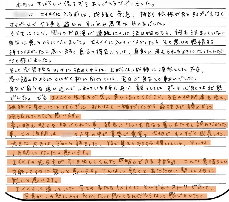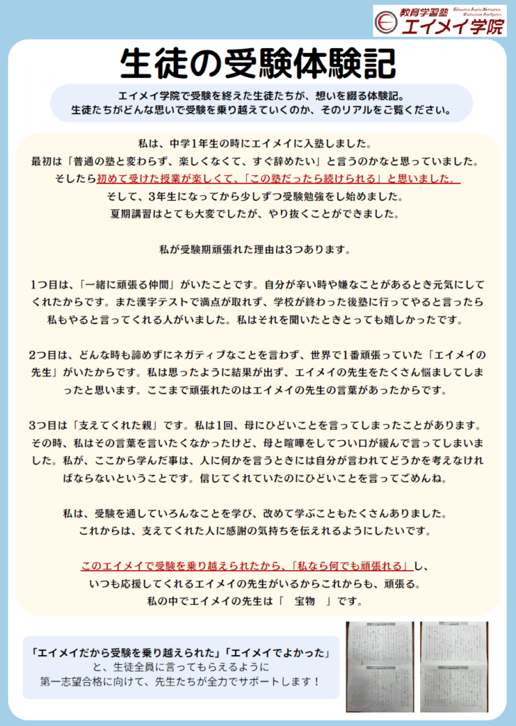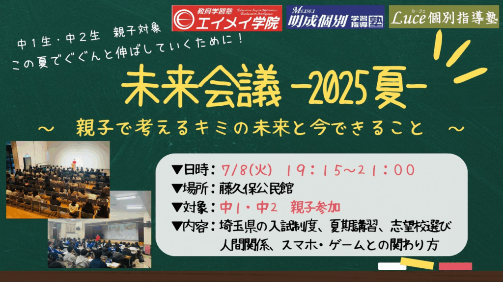 【鶴瀬校】保護者会のご感想 & イベント申込 投稿日 2025年6月29日 著者 yone カテゴリー エイメイ学院鶴瀬校舎ブログ カテゴリー お知らせブログ(エイメイ学院鶴瀬校舎) カテゴリー 新着情報 カテゴリー 顔デカ塾長のブログ ー エイメイ鶴瀬、米本 保護者会のご視聴、 本当にありがとうございました! 保護者会の最後にお話した、 生徒の想いと、保護者様の想いを載せておきます。 保護者会のご感想 エイメイ鶴瀬 中学部保護者会アンケート保護者会のご視聴、誠にありがとうございました。今後の指導の改善のため、アンケートにご協力ください。docs.google.com ⚠️ご感想、必ずお願いします! 7/7(月)【中3】イベント開催! お申し込みはコチラ! 【鶴瀬校】中3 受験生決意会受験生の夏は、 まさに 「勝負の夏」 本気を尽くして、「受験生」になる。 勝負の夏に挑む前に、 受験生とし…www.eimeigakuin.jp 7/8(火)【中1.2】イベント開催! お申し込みはコチラ! 1・2年生「未来会議 ~2025夏~」保護者参加申し込み保護者様は、こちらからイベント参加のご予約をお願いいたします!▼日時: 7/8(火)19:15〜21:00▼場所: 藤久保公民館今回のイベントは、親子参加型です!夏の過ごし…docs.google.com 7/12(土)、13(日)【全学年】高校紹介イベント! 参加はコチラから! 「YOUは何しに高校へ?~高校生のホンネ~」参加申し込みこの会は、自分の志望校に通っているEIMEIの先輩から、学校生活についての生の声を聴くことができます✨(先輩の都合もあるので、確実に志望校の先輩の話が聞けるとは限りま…docs.google.com それぞれ、 お申し込みください! シェア ツイート LINE この記事を書いた人 yone 記事一覧