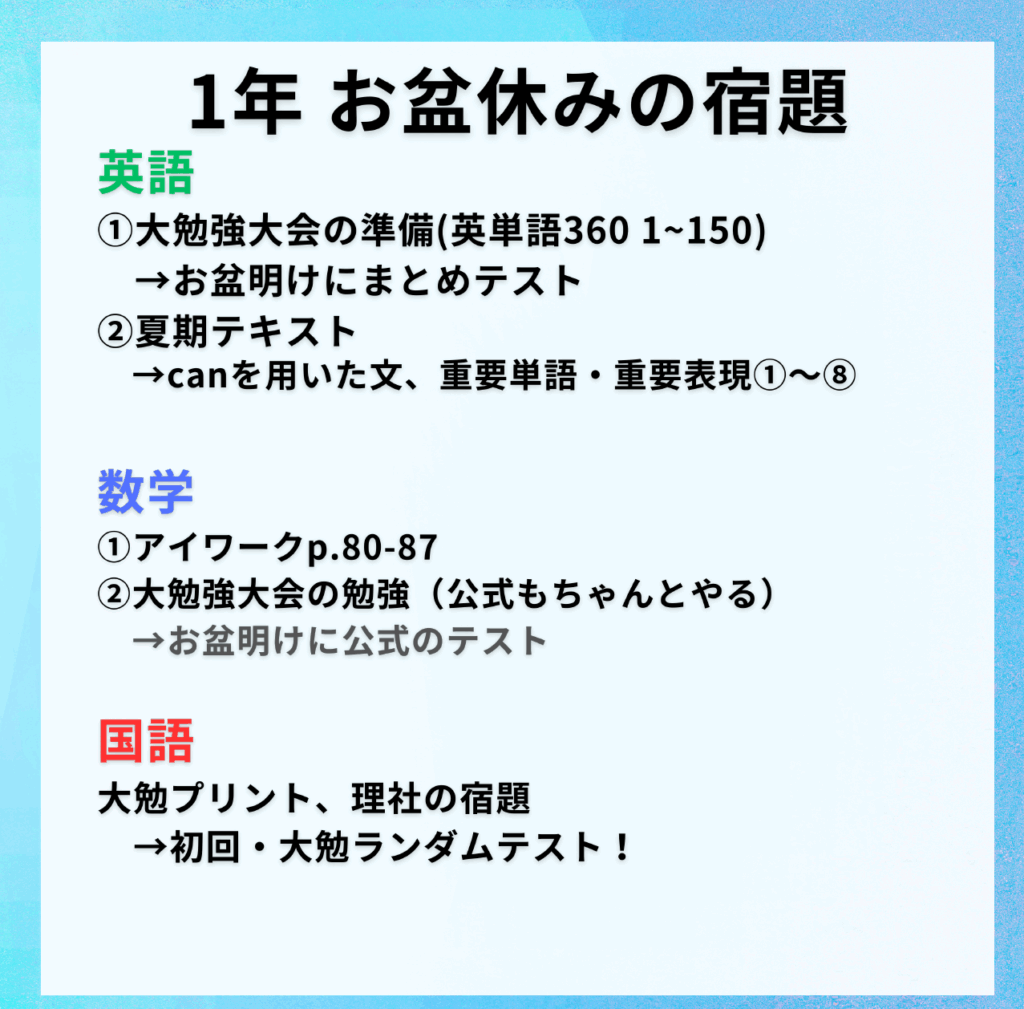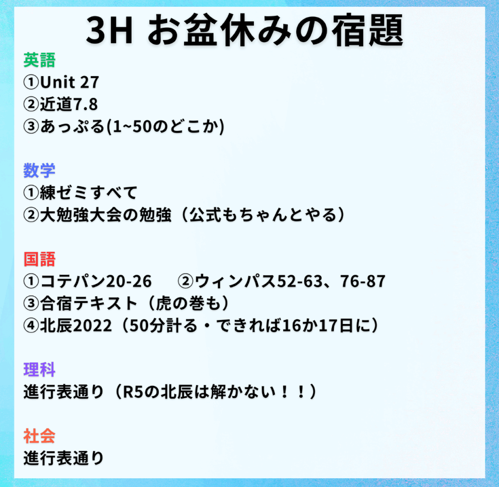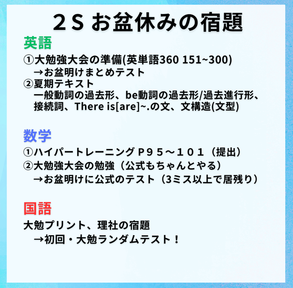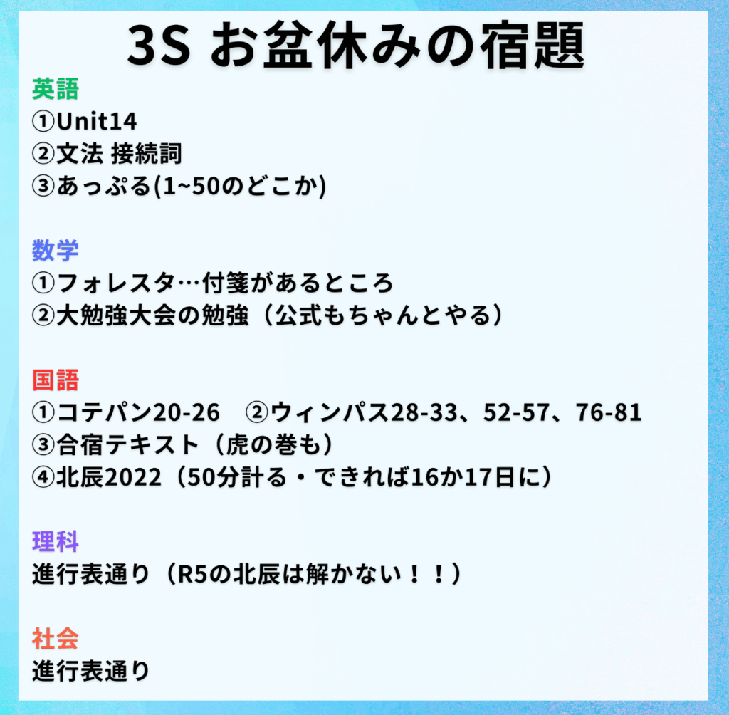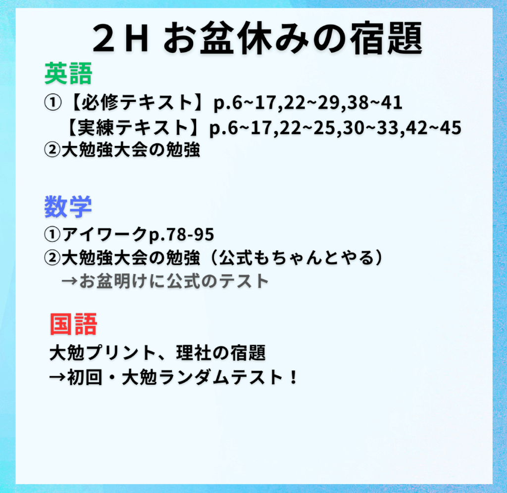夏期講習の授業がない期間中は、各学年、各教科、宿題が出ています!
