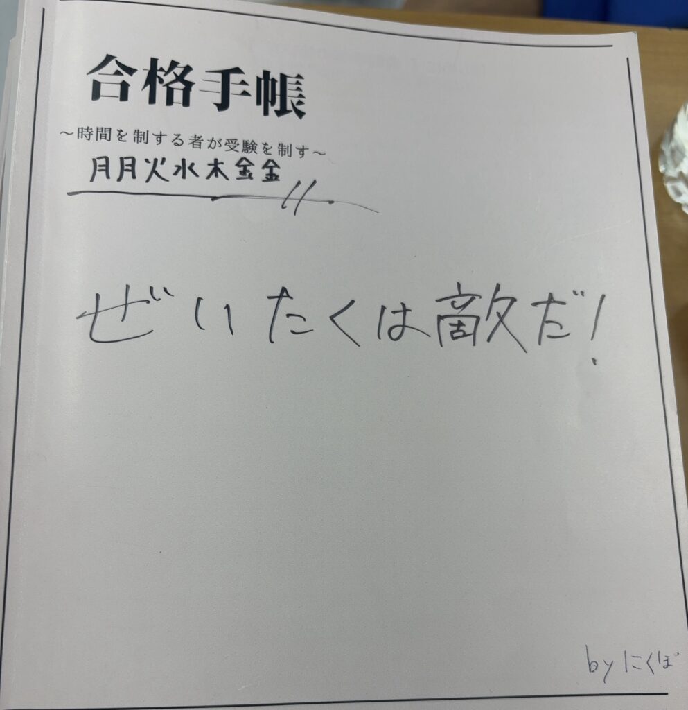 社会科の平出先生との面談を機に、合格手帳に荒々しい言葉を表紙に残しているK君!