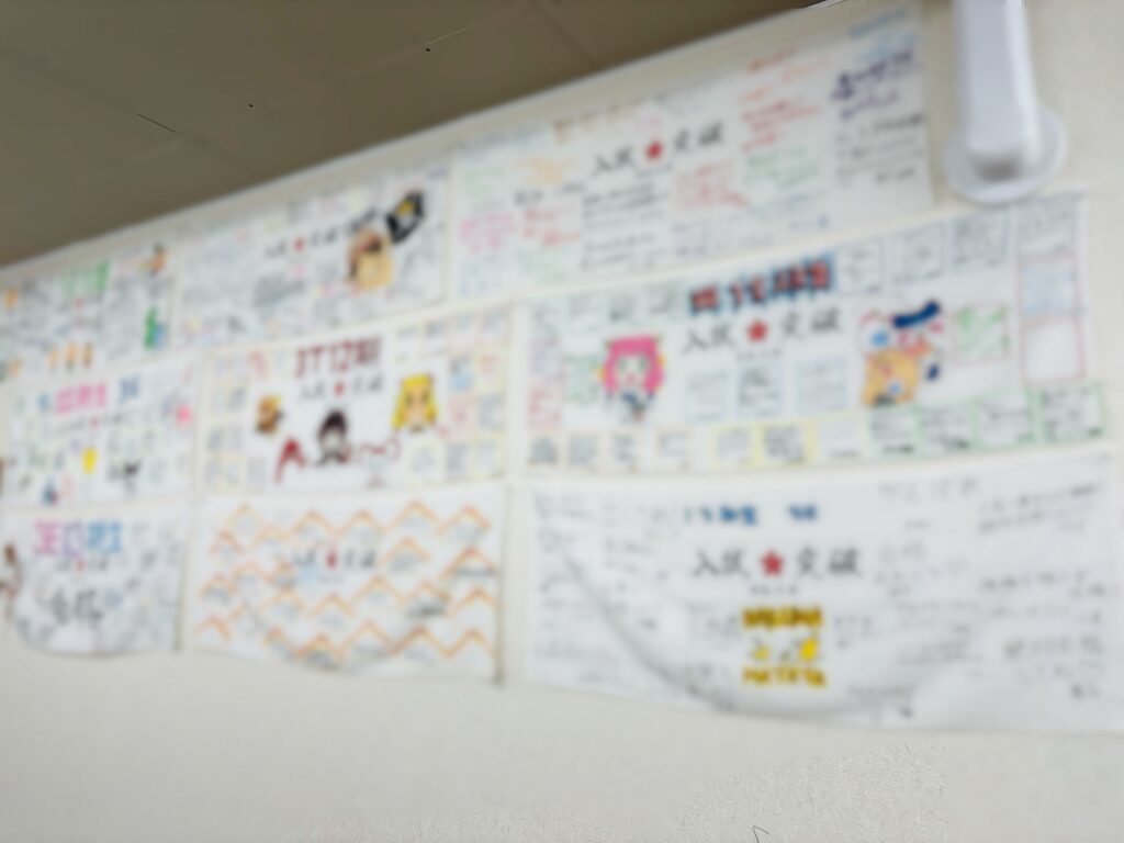 エイメイ鶴瀬の大教室には、湯島天神で買うハチマキに、その学年のクラスごとに寄せ書きを作っています!