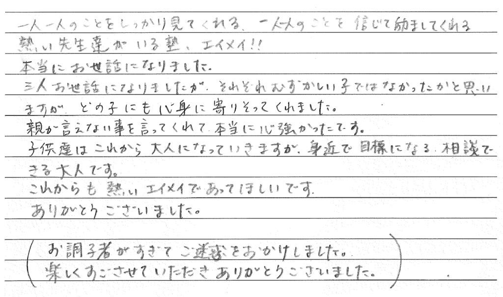 一人一人のことをしっかり見てくれる、一人一人のことを信じて励ましてくれる熱い先生達がいる塾、エイメイ!!