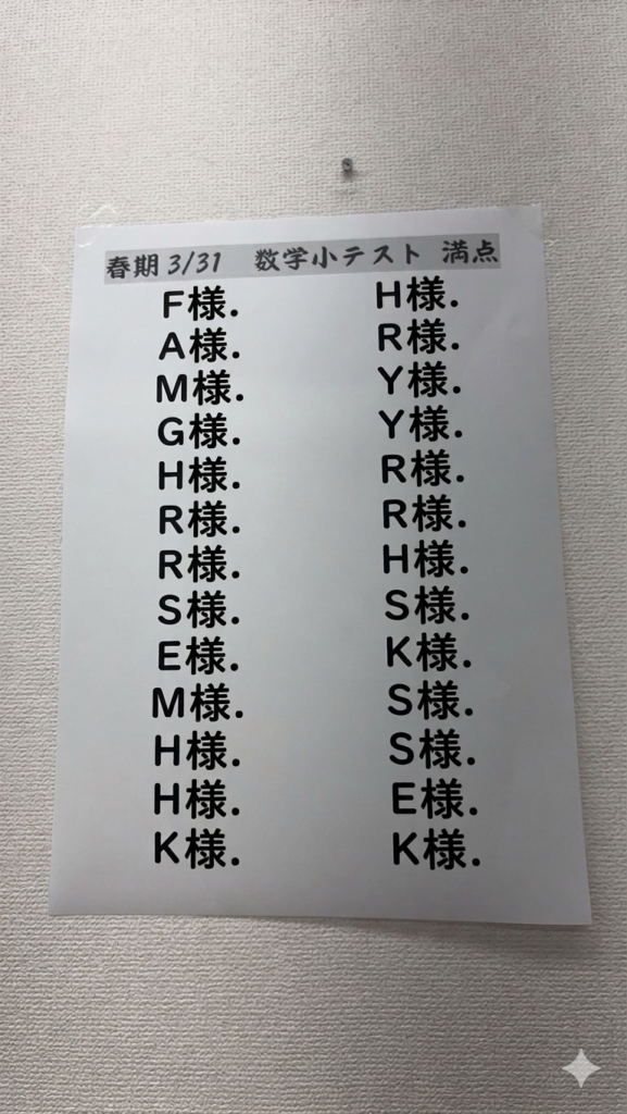 3/31に行った数学の小テストで満点を取った生徒を教室に掲示しています!