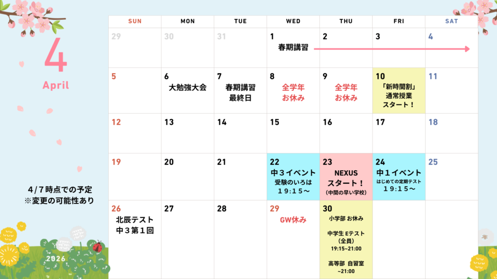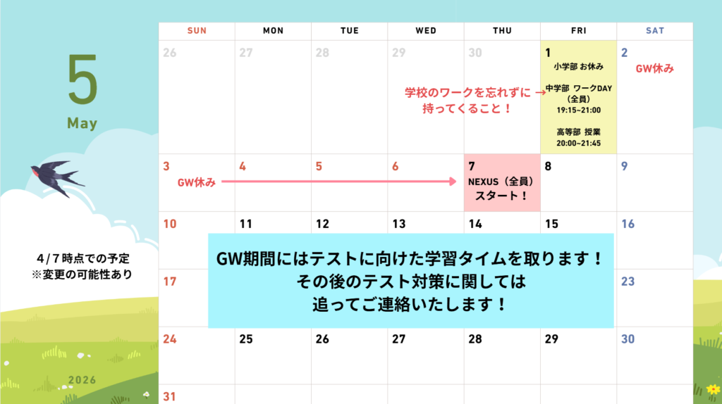 4/29、5/2~6は、年間授業数調整のためお休みです!