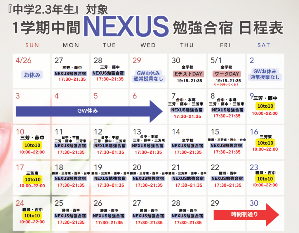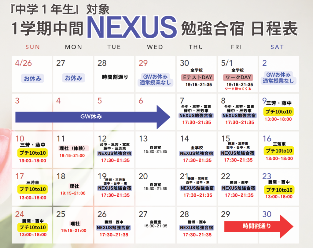 4月30日(木)と5月1日(金)はEテストdayとワークdayで中学生は全員通塾になります!