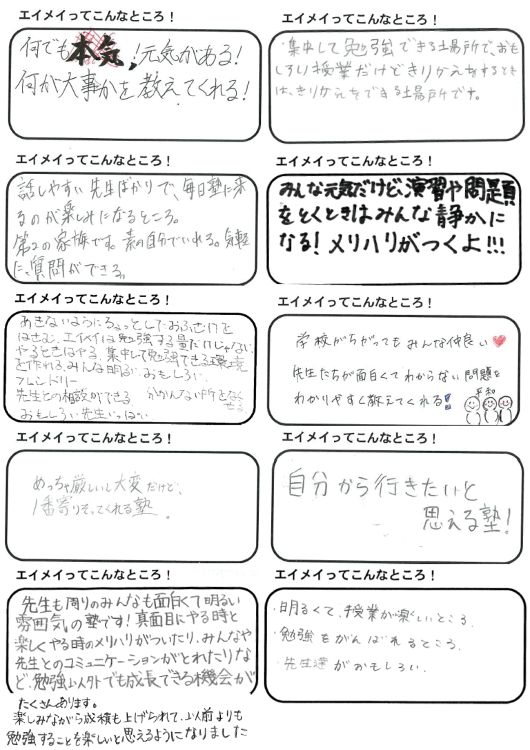 エイメイ学院鶴瀬校舎の小学部は、週2通塾で、国数英の3教科を教えるが、そのすべての教科内の授業で毎回テストがある。