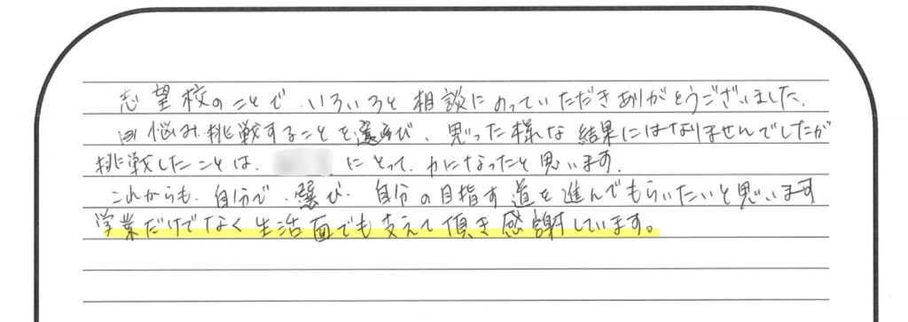 【ソヨカふじみ野】親からみたエイメイ~保護者の受験体験記⑪~2024 投稿日 2024年3月12日 著者 けんご(ごーけん) カテゴリー Uncategorized カテゴリー エイメイ学院トナリエふじみ野(旧ソヨカ)校舎ブログ カテゴリー ごーけん先生のブログ カテゴリー 飯塚塾長のブログ|エイメイ学院ソヨカふじみ野 志望校のことでいろいろと相談にのっていただきありがとうございました。 悩み挑戦することを選び思ったような結果にはなりませんでしたが 挑戦したことは◯◯にとって力になったと思います これからも自分で選び自分の目指す道を進んでもらいたいと思います 学業だけでなく生活面でも支えて頂き感謝しています。 シェア ツイート LINE この記事を書いた人 けんご(ごーけん) 記事一覧
