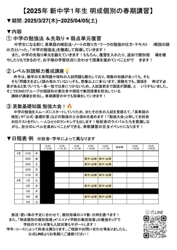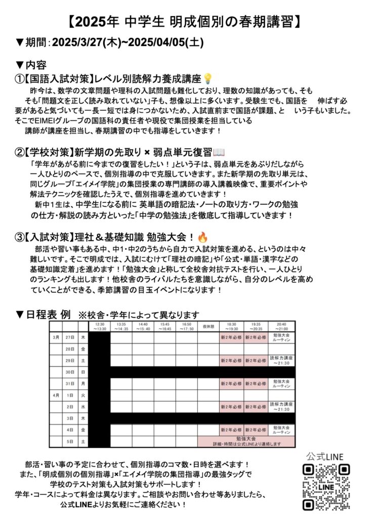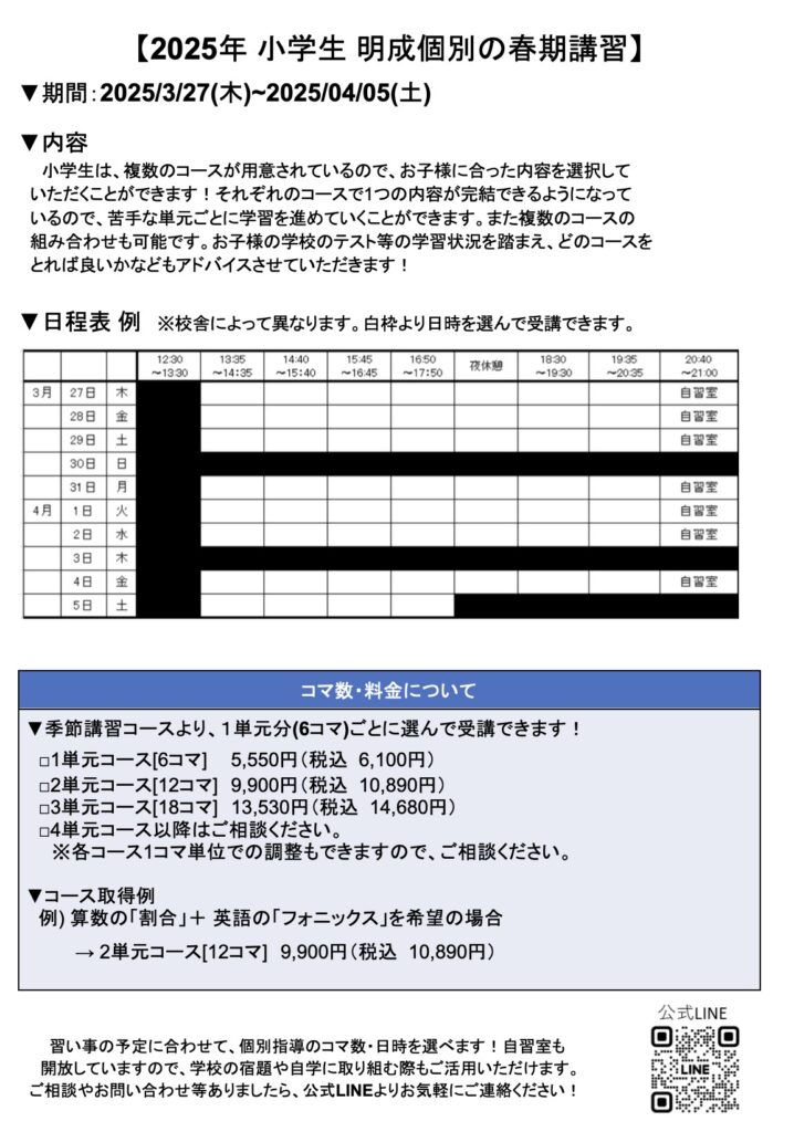 【2025春期講習】 🌸最新情報やお申し込みについて🌸 投稿日 2025年3月16日 著者 川越南大塚校 塾長 上田 健太 カテゴリー Uncategorized カテゴリー 南大塚校舎/明成個別 カテゴリー 富士見羽沢校舎 カテゴリー 志木校舎|明成個別 カテゴリー 新着情報 カテゴリー 明成個別ふじみ野西口校舎 カテゴリー 明成個別南古谷校舎 カテゴリー 明成個別富士見羽沢校舎 カテゴリー 明成個別新河岸校舎 カテゴリー 明成個別朝霞台校舎 カテゴリー 明成個別水谷校舎 カテゴリー 明成個別鶴瀬東校舎 カテゴリー 鶴瀬西校舎 明成個別 目次 【新3年生/新2年生】期間や詳細について 【新1年生】期間や詳細について 【小学生】期間や詳細について 各種キャンペーン 🌸春期講習入塾キャンペーン実施中🌸 超期間限定!🔥友達紹介キャンペーン実施中🔥 ご質問/お問い合わせ/お申し込みについて ご質問やお問い合わせはこちらから ⬇︎ LINE Add Friendlin.ee シェア ツイート LINE この記事を書いた人 川越南大塚校 塾長 上田 健太 記事一覧
